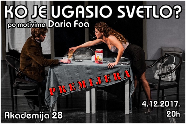Premijerno, u ponedeljak 4. decembra u Akademiji 28 biće izvedena diplomska predstava "Ko je ugasio svetlo?" mladog reditelja Bogdana Živkovića.