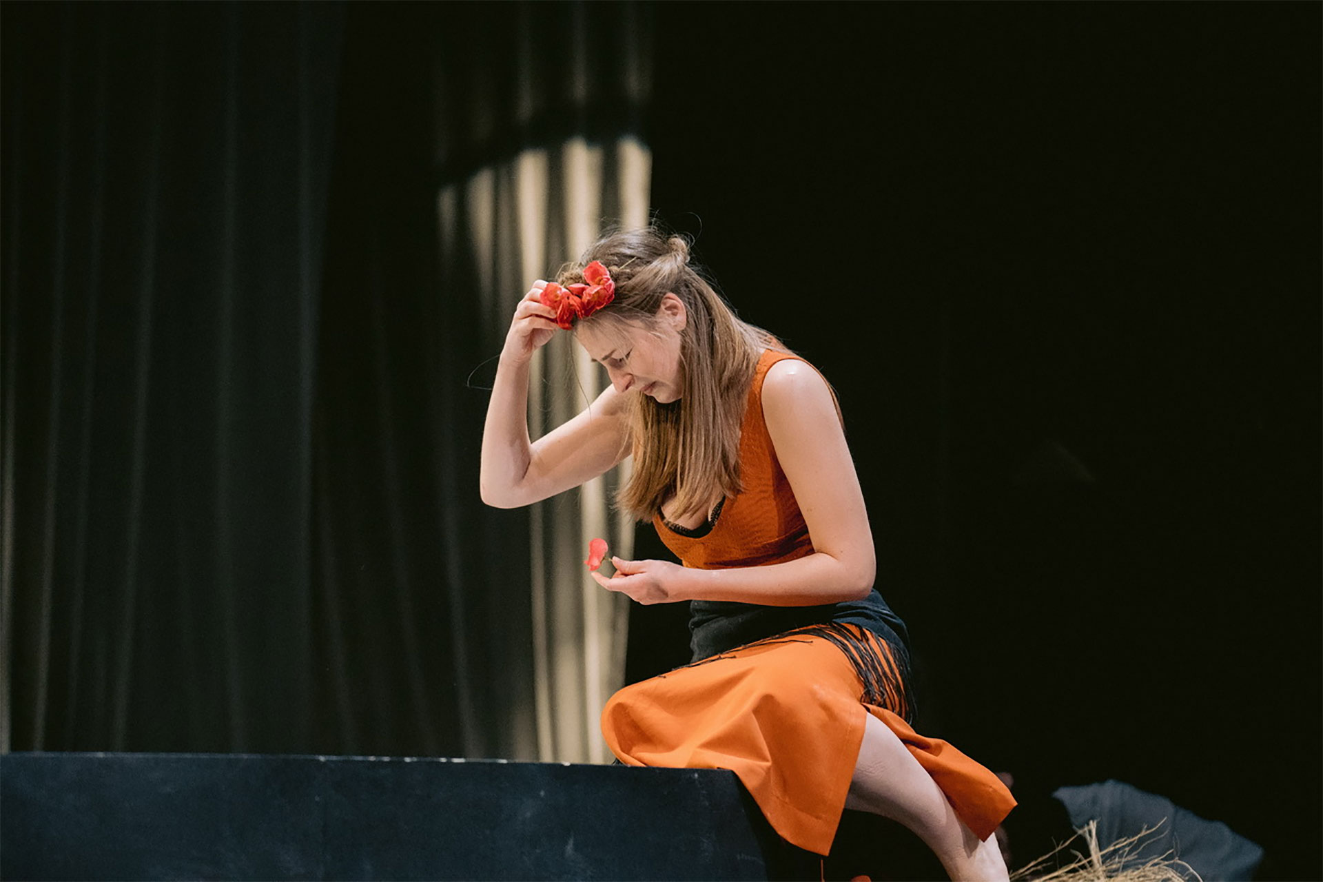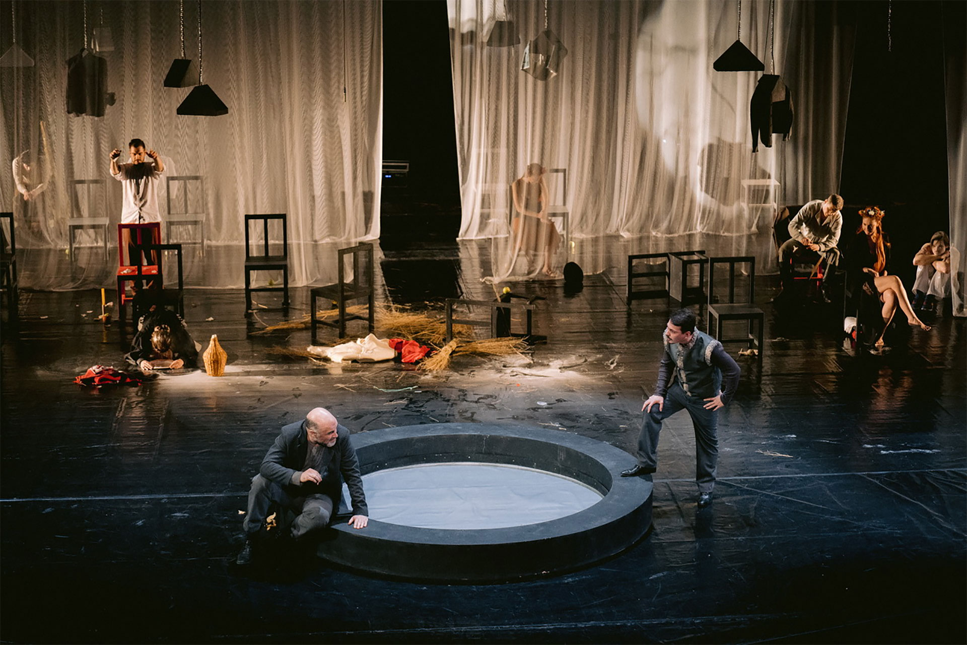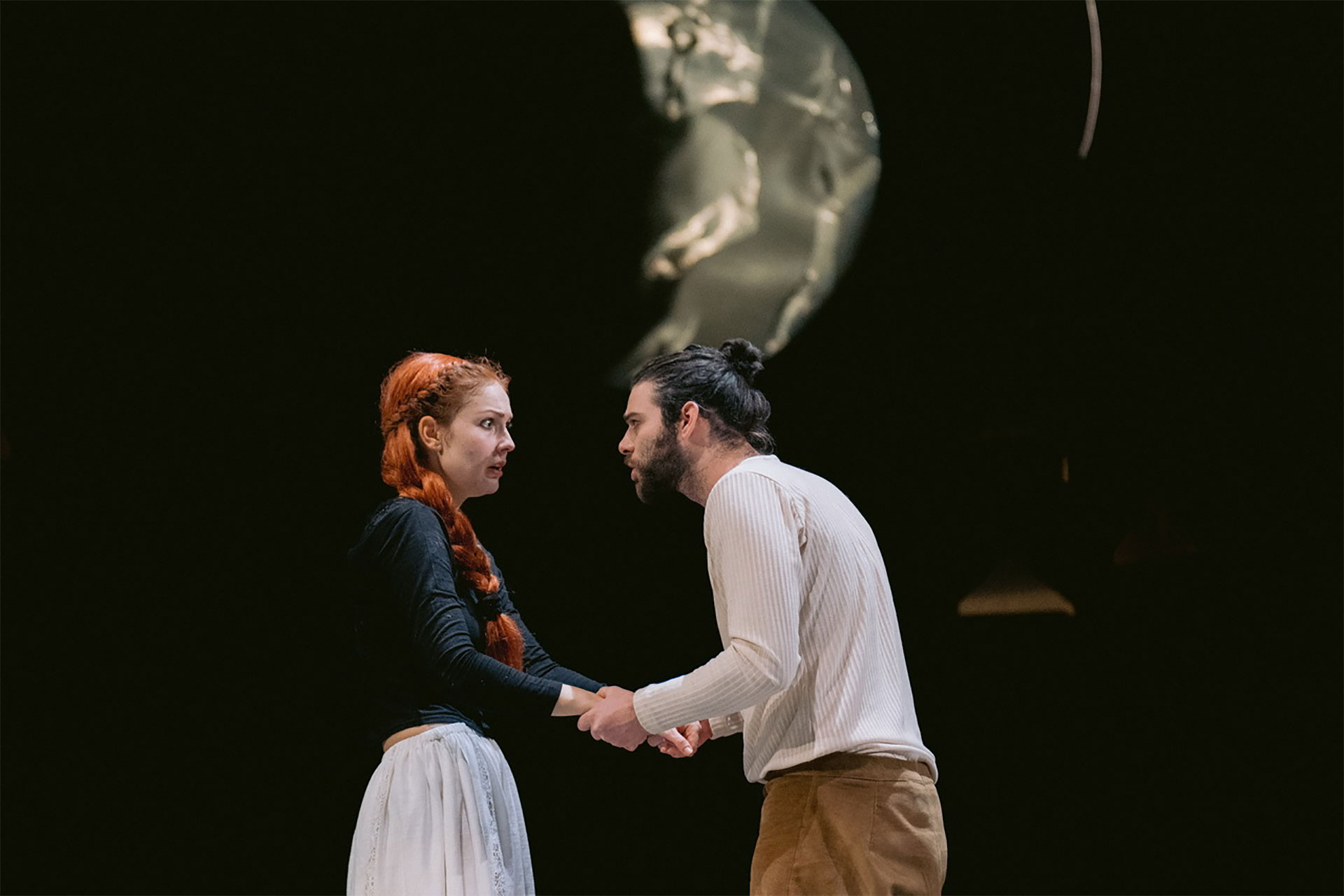 Magdalena (u vrlo dinamičnoj izvedbi Sonje Isailović) predstavljena je kao klasična femme fatale, svojevrsna Lilit, u crnom, crvene kose, pohotna i ovozemaljska, dok nasuprot njoj imamo Romana, koji gotovo da je otelotvorenje spiritualnog, sav nepostojan, proziran i više kao kakvo priviđenje u odnosu na eros koji predstavlja Magdalena. Svaki od likova nosilac je jedne kobi za sebe, nesreća se prenosi generacijski i čeka se momenat i neko ko će da prepravi prvobitni greh. Tako na sceni imamo praktično sve snažne i semantički bogate simbole iz slovenske mitologije - bazen sa vodom (koji nosi značenje htonske granice između dva sveta - sva previranja između erosa i tanatosa dešavaju se upravo u dometu ovog bazena, od pokolja Sirčanina i Podoljca, do finalnog spajanja Magdalene i Romana), krvavi mesec, čas zlosutan, čas mističan, kao Lorkin.