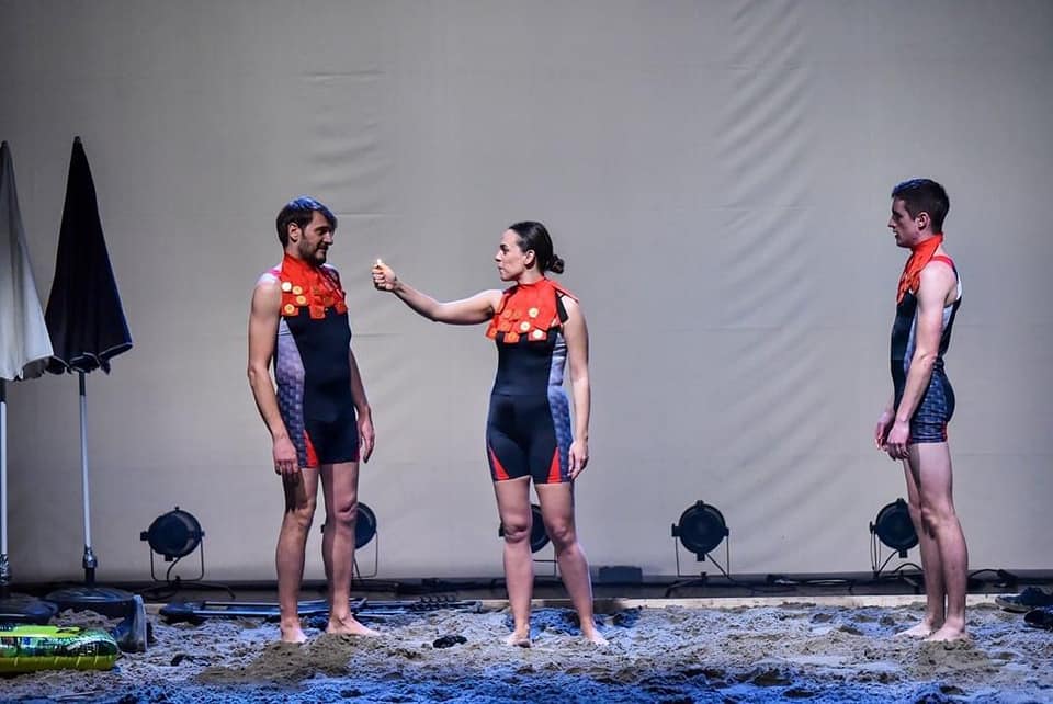 Izvođenje predstave naime izgleda pomalo apstraktno. Ne postoje konkretni dijalozi koji se vode između aktera (Frano Mašković, Luka Knez, Iva Kraljević i Semih Adigizel), često se koriste bespredmetnim radnjama poput veslanja čamca ili bacanja kamenčića i sled scena je brz ali ne i kristalno jasan i povezan. Na scenskoj peščanoj plaži odvijaju se kratki događaji kroz koja se smenjuju različita stanja glumaca koja možemo uočiti: od gorčine i očaja, preko tuge i jada, pa sve do nemoći i bezvoljnosti. Dosta toga je bazirano na telesnosti kroz besmislene ali odlično utemeljene pokrete. Ujednačeno i odmereno toniranje svetla i adekvatna muzička pozadina kroz šumove mora i ptica markiraju teskobnu atmosferu.