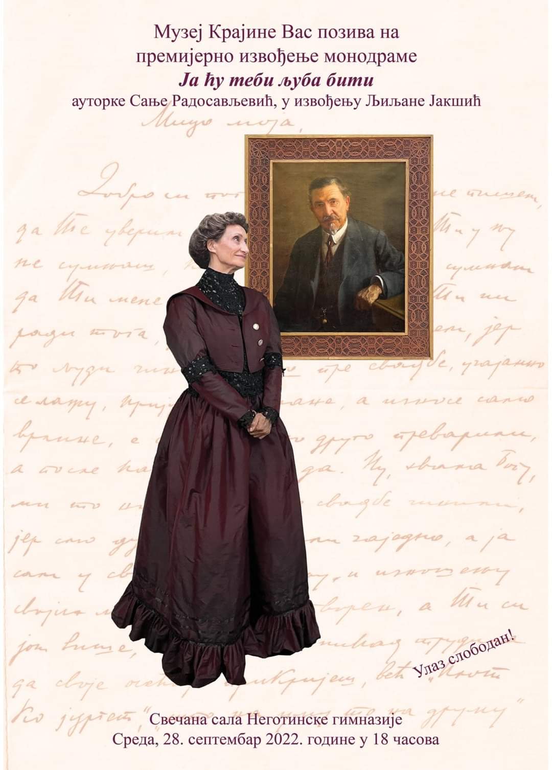 U sredu, 28. septembra, od 18 časova, u Svečanoj sali Negotinske gimnazije biće premijerno izvedena monodrama Muzeja Krajine „Ja ću tebi ljuba biti” autorke Sanje Radosavljević. Uloga Marije Mice Mokranjac, koja će nam govoriti o životu i delu Stevana St. Mokranjca, poverena je glumici Ljiljani Jakšić.