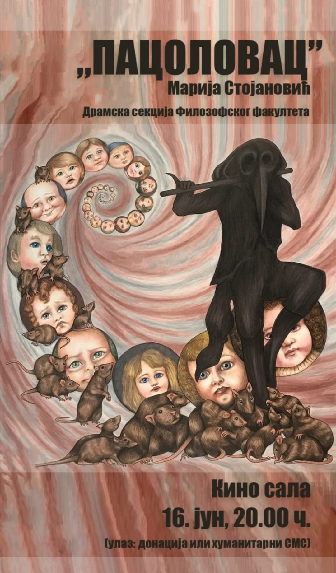 Kuga, kao hroničarski fakt, u ovom komadu razlivena je na umirući sistem vrednosti, kojim preovladava liderska nezajažljivost, jednomišlje i korupcijska beskrupuloznost. Tako shvaćena, najezda pacova zadobija ljudskoliko obličje i postaje odraz etičke destrukcije, koju će, odnoseći nadu, simbolički predstavljenu utapanjem podmlatka, zapečatiti melos mističnog „spasitelja”.