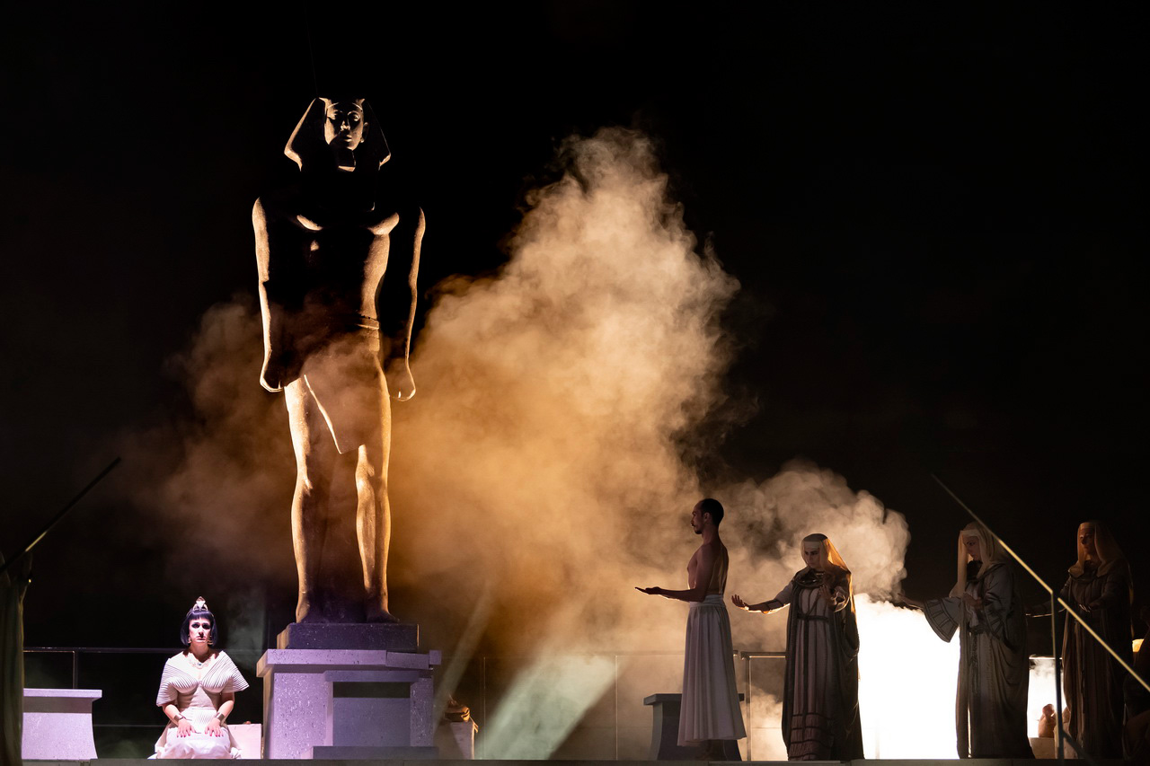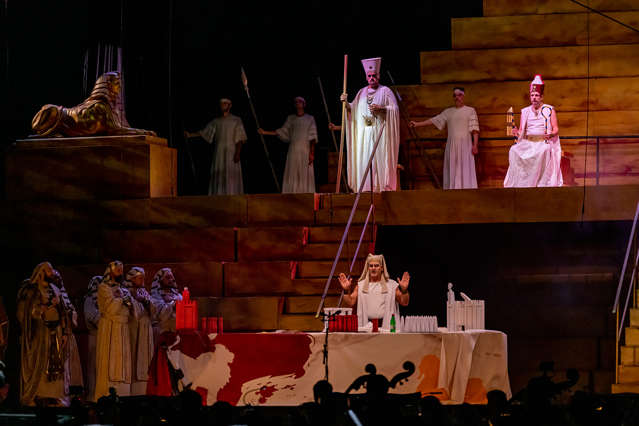 Odvešće vas u doba faraona. Među svešetnice i sveštenike, vojskovođe i vojnike, egipatski narod i etiopsko roblje, u Memfis i Tebu kojima mnoštvo glasova kliče - „Večna nestvarna vatro, od koje Sunca nasta zrak“. Priča sudbinsku priču o nemogućoj ljubavi. O sukobu dve države, dva vladara i dva oca, dve princeze i suparnice. Zlatno i crno. Velelepna scenografija, piramide i sfinge, statue staroegipatskih božanstava, pružaju osećaj prisustvovanja nečem mnogo većem od svih nas. Sedam slika uklopljenih u četiri čina tonu u dubinu i upućuju na slojevitost ove velike opere. Fantastične solo deonice, dueti (među kojima bih izdvojila talenat Jelene Končar u ulozi Amneris i Stefana Karanca kao Radamesa), kao i impresivan broj umetnika na sceni, zaokružili su priču. Religijski obredi i ratni planovi, kao i marševi ispevani od strane horskih izvođača i odigrani od strane baletskog ansambla i solista, doneli su istoriju na scenu. Baš u jednoj takvoj solističkoj, horskoj i baletskoj harmoniji sramotne reči pale su sa Aidinih usana: „Vrati se kao pobednik“.