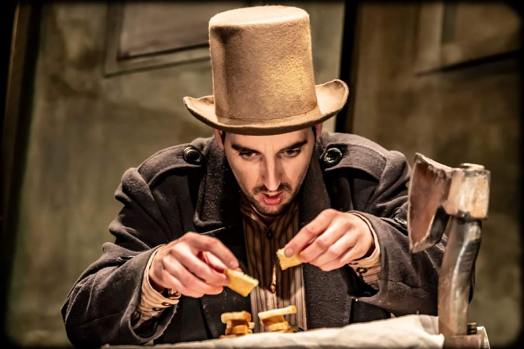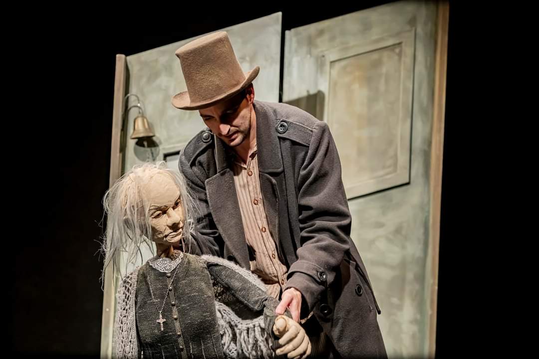 Glavni glumac u predstavi je Aleksandar Milković u ulozi Raskoljnikova, dok ostale likove iz romana oživljava svojim glasom uz pomoć raznih predmeta koji na njih asociraju: Marmeladov - flaša alkohola, Aljona Ivanovna - lutka, Katerina Ivanovna - crna marama, deca - cipele, inspektor - kamen, policajci - cigarete, i Sonja, koja je jedan deo predstave u obliku šešira, a potom i utelovljena od strane glumice Dragane Ilić putem videa.