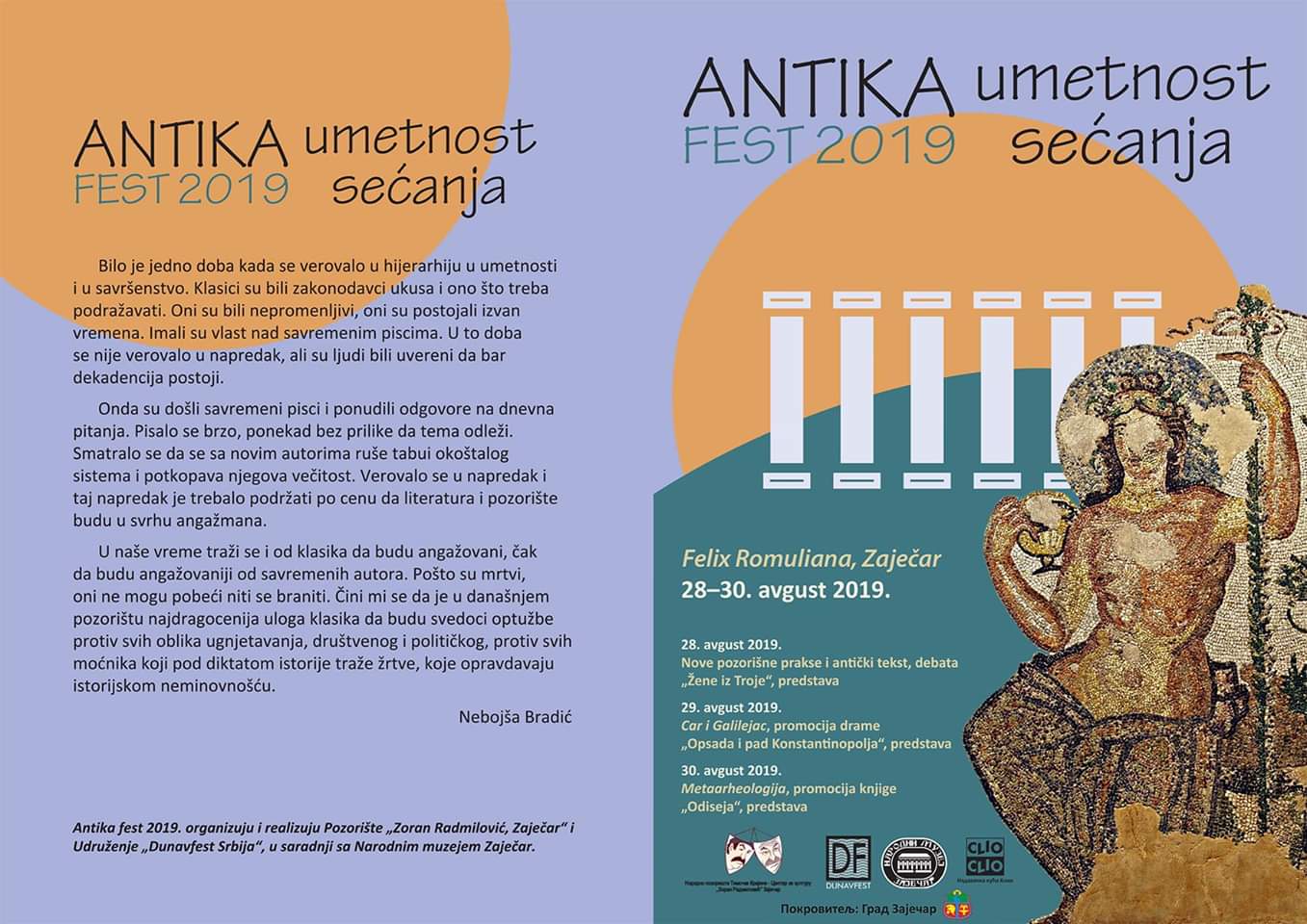 ,,Antika fest” na kasnoantičkom lokalitetu Feliks Romulijana kod Zaječara, obnovljen posle dve godine pauze, ponudiće publici od 28. do 30. avgusta tri pozorišne i scensko-muzičke predstave, objedinjene sloganom ,,Umetnost sećanja”, kao i prateći program.