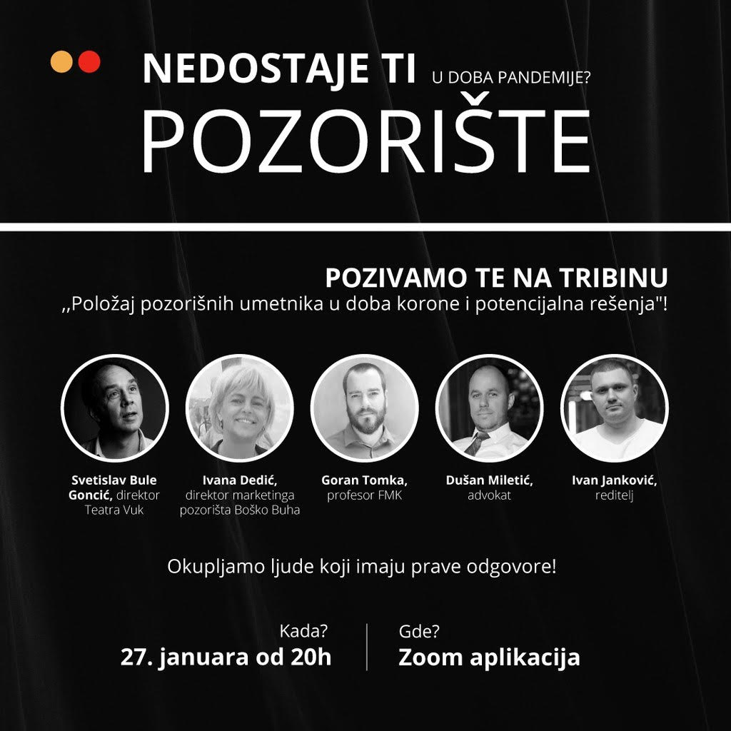 Online tribina pod nazivom „Položaj pozorišnih umetnika u doba korone i potencijalna rešenja” u organizaciji mladih kreativaca okupljenih oko projekta PlayBox biće održana 27. januara sa početkom u 20h putem Zoom platforme.