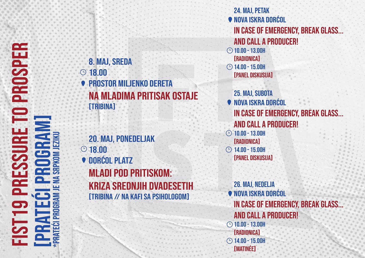 Ove godine festival prati i bogat prateći program koji je započeo 8. maja tribinom sa organizatorima „Na mladima pritisak ostaje” koja je govorila o socijalnoj, ekonomskoj i političkoj participaciji mladih u Srbiji. Pred samo otvaranje festivala 20. maja u 18h u saradnji sa Hemofarm fondacijom, organizovana je tribina „Na kafi sa psihologom” koja se bavi pritiscima sa kojima se mladi suočavaju, a jedan od govornika biće glumac Ognjen Mićović. „In case of emergency break glass and call a producer” je trodnevna radionica posvećena usavršavanjem budućih pozorišnih producenata i sačinjena je od različitih radionica i panela čiji su predavači i govornici uspešni pojedinci iz sveta umetnosti, ali i korporativnog sektora.