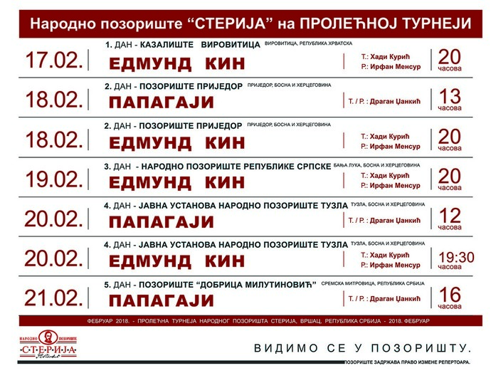 Ansambl Narodnog pozorišta "Sterija" biće na prolećnoj turneji u februaru u našoj zemlji i u zemljama regiona sa svojim predstavama "Edmund Kin" i "Papagaji". Na fotografiji ispod pogledajte detaljni plan turneje.