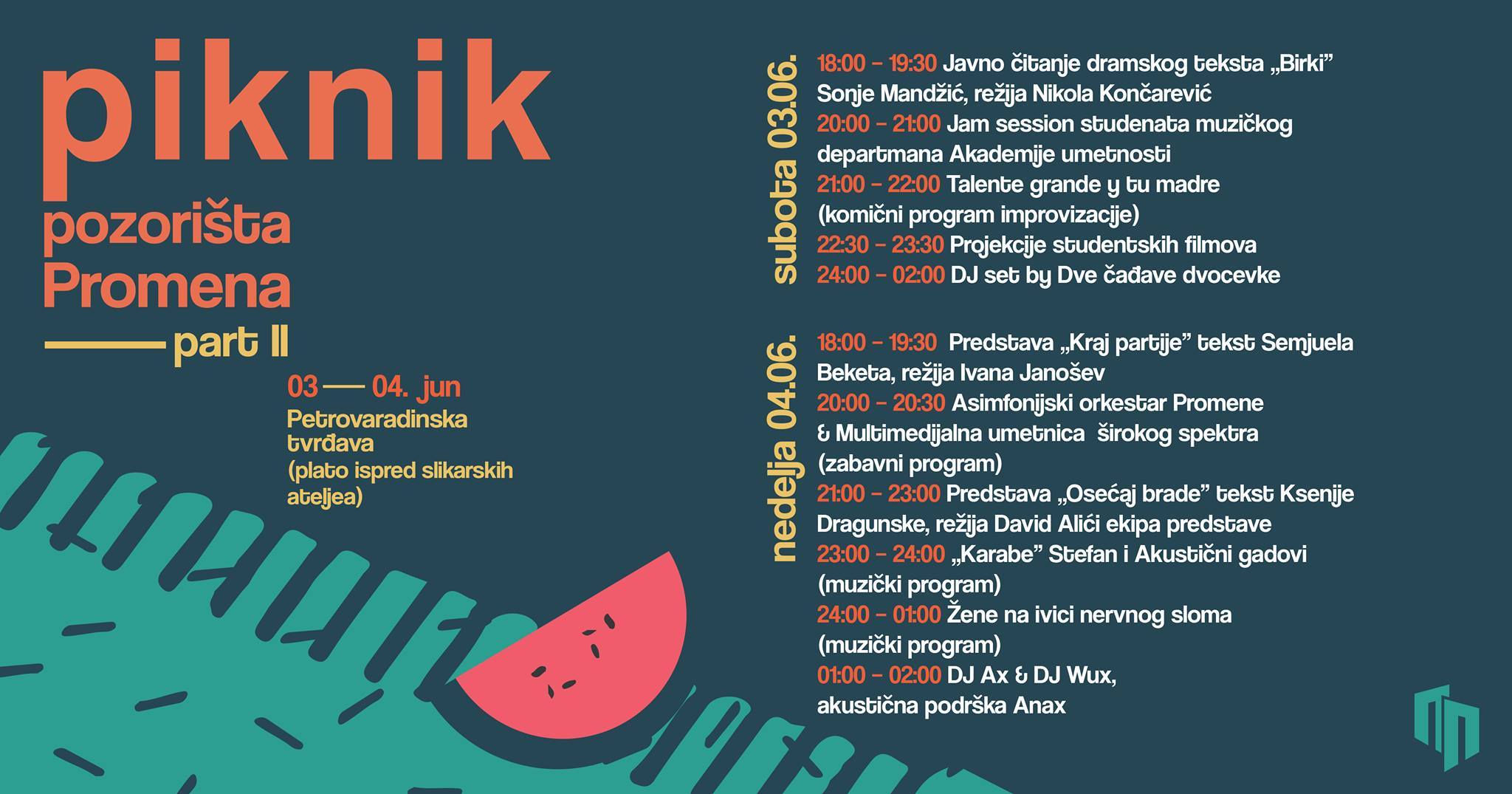 Neki možda znaju, neki ne, Promena je pozorište osnovano od strane studenata Akademije umetnosti u Novom Sadu. Skoro svakog vikenda možete ih posetiti u prostoru Akademije gde igraju svoje predstave. Ovog vikenda program i mesto nešto su drugačiji od standardnog. Promena piknikuje na platou ispred slikarskih ateljea, na Petrovaradinskoj tvrđavi, a osim pozorišnog, biće i muzičkog programa. Evo šta su sve promenaši pripremili za vas:
