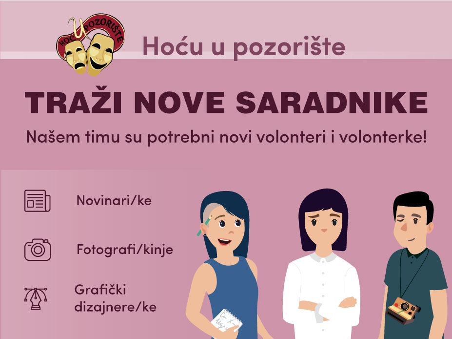 Tražimo mlade ljude od 16 do 26 godina iz svih krajeva Srbije koji su zaljubljeni u pozorište, entuzijastični, dobri timski igrači i spremni da ulože svoje vreme i talenat u volontiranje na portalu promišljajući i promovišući pozorište na drugačiji način.