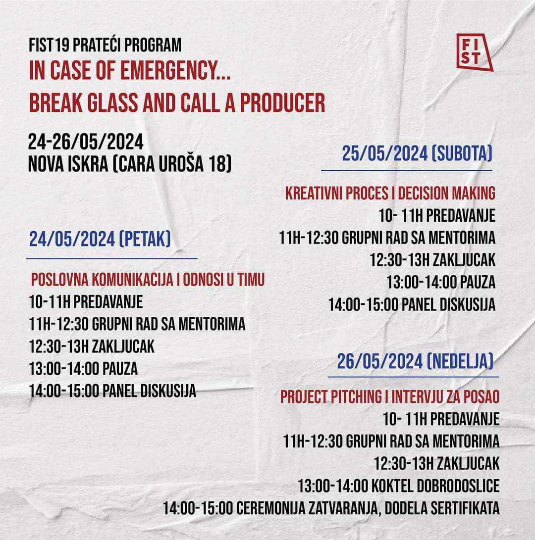Ukoliko te zanima kako nastaje jedan umetnički projekat i koja je uloga pozorišnog producenta u njemu, prijavi se na program „In case of emergency… break glass and call a producer”! Ovaj intenzivni program usavršavanja namenjen je studentima iz Srbije i regiona koji svoju karijeru vide u polju umetnosti i kulture, a održaće se 24, 25. i 26. maja u Novoj Iskri (Cara Uroša 18, Beograd). „In case of emergency… break glass and call a producer” je deo programa 19. po redu Festivala internacionalnog studentskog teatra (FIST) koji organizuju studenti Fakulteta dramskih umetnosti u Beogradu.