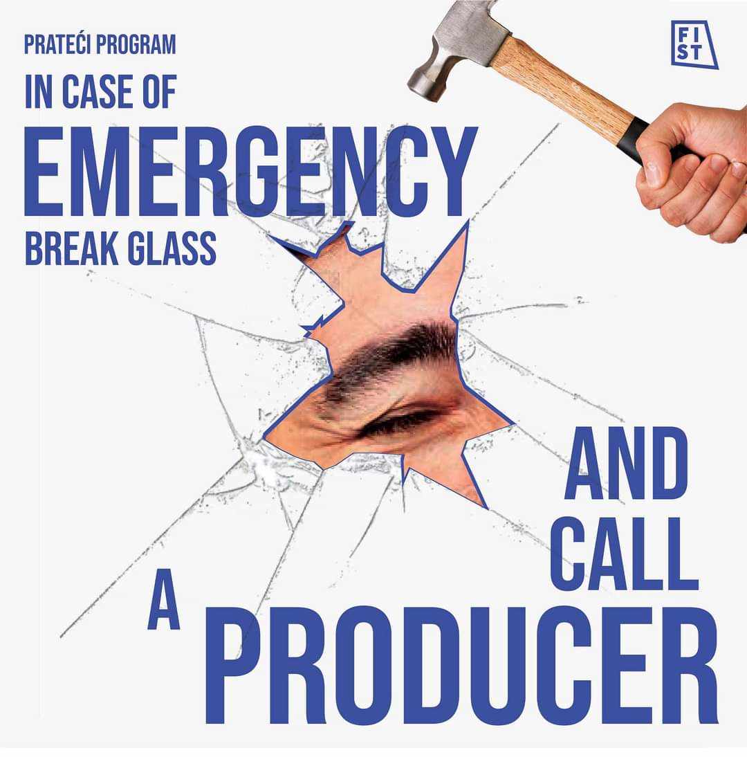 „In case of emergency… break glass and call a producer” je trodnevni program sačinjen iz radionica i panela, u trajanju od 10 do 15 časova, čiji su predavači i govornici uspešni pojedinci iz sveta umetnosti, ali i korporativnog sektora. Cilj programa je da, kroz radioničarski rad, sučeljavanje perspektiva i otvoreni dijalog, studenti steknu nova znanja, ohrabre se da podele svoja razmišljanja sa profesionalcima i upoznaju buduće kolege iz svoje branše.