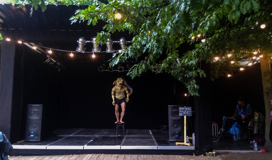 Predstave koje sam pogledala bile su Monsters i Monkey mind. Prva je bila predstava za decu, u trajanju od dvadesetak minuta, gde jedan glumac predstavlja rađanje Minotaura- sunđeraste lutke koja je na poečtku potpuno skupljena, a koju on postepeno razvija i navlači na sebe pa njegove noge postaju noge Minotaura, a provlačenjem ruke kroz lutkina usta, koristeći svoje prste, stvara iluziju opasnih i oštrih zuba čudovišta. Iako je predstava bila na otvorenom, mališanima nije smetalo da sede na kiši, ko sa kabanicom ili kišobranom, ko bez, i odgledaju je do kraja, a moram priznati da, iako kratka, predstava zaista drži pažnju, uz facijanu ekspresiju i zvučen efekte koje prvi glumac.