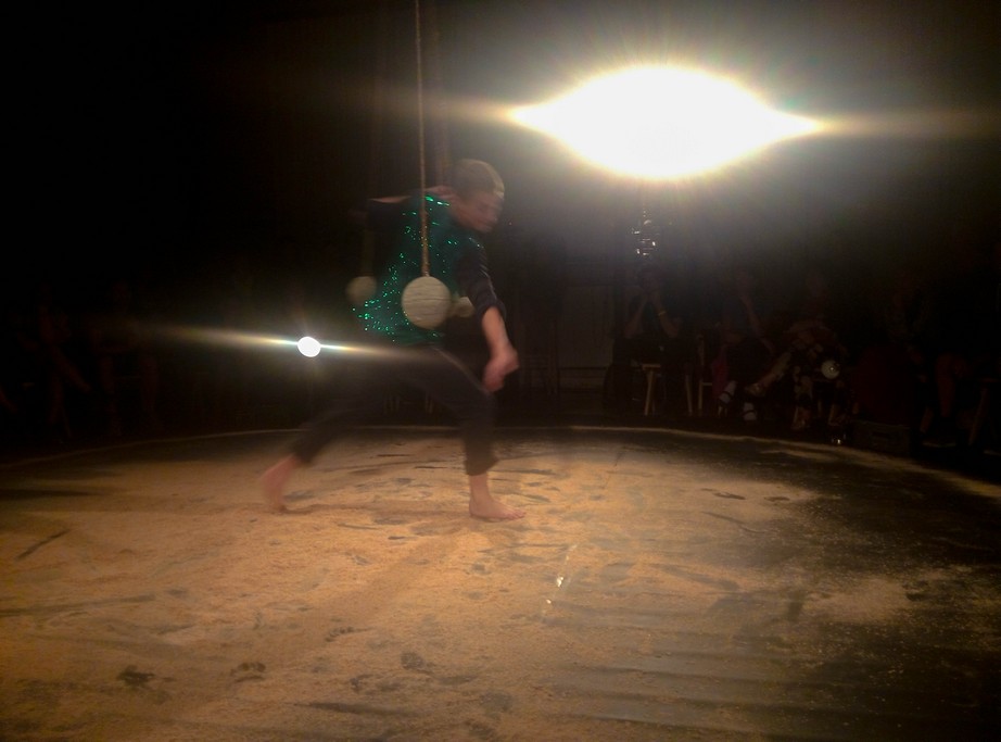 Piste je bio drugi performans, održan u fiskulturnoj sali jedne škole, gde se izvođač poigravao dajući pojedinim gledaocima iz prvog reda da upravljaju lampama koje osvetljavaju kružni prostor na sredini sale u okviru koga se on kreće. Kada kažem kreće mislim- stoji na vrhu merdevina na koje su pričvršćeni točkovi, i koje okreće njegova asistentkinja, stvaljaući sebe u poziciju da se nađe u potpunom mraku, ukoliko odabrani gledaoci odluče da ugase sve lampe. Pored balansiranja na vrhu merdevina sa dve kofe pune piljevine koju posipa, zakačene za kanap koji mu visi oko vrata, performans se nastavlja žongliranjem piljevine, pokušavajući da piljevinu iz jedne šake prebaci u drugu, pri tom se okrećući i izvrćući. Treći deo performansa se sastojao iz igre klatnima. Četiri teška, betonska klatna bila su okačena za konopce različite dužine- dovoljno duge da se štrecnete misleći da će vas udariti, a dovoljno kratke da do tog nemilog događaja ne dođe. Nakon što ih je zaljuljao, različitim ritmom, izvođač se nanovo poigravao ravnotežom, brzinom kretanja klatna i svojim telom, te se provlačio između njih, izbegavajući ih, vrteći se u krug oko njih. Rekla bih da je ovaj performans na zanimljiv način spojio cirkusku preciznost, ples i fiziku, što mi se posebno svidelo.