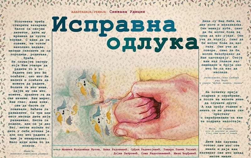 „Postoje situacije, i to ne malobrojne, u kojima i bebe imaju svoju priču, a o kojima niko ne govori. Zato naša predstava želi da priča upravo o tome, u ime svih beba čiji početak života nije bio tipičan, koje nisu voljene došle na svet, koje nisu razumele zašto su drugačije od drugih beba i u ime onih koje su imale sreće da se adekvatna institucija i zaposlene radnice potrude kako bi im našle odgovarajuću mamu. Koliko god da je za proces usvajanja deteta potrebna samo ljubav i želja, on je vrlo kompleksan, jer usvajanje nije samo susret tri osobe. To je susret tri priče. Usvojitelji moraju prvo da prihvate svoju priču, kako bi zatim prihvatili priču svog deteta, a onda i da pomognu detetu u prihvatanju njegove priče, što je možda najvažnije od svega”, dodala je rediteljka, koja je ujedno radila i na adaptaciji teksta, a koji je nastao po motivivima filma „U sigurnim rukama”.