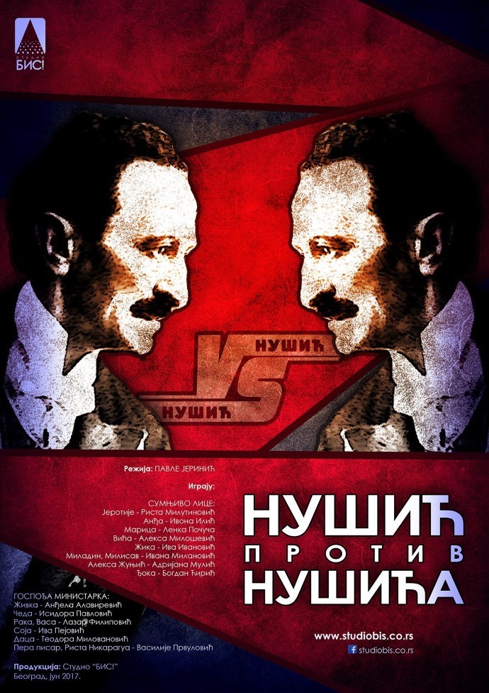 To je naša nova predstava - komedija "NUŠIĆ PROTIV NUŠIĆA", sastavljena od delova dve poznate komedije B. Nušića - "Sumnjivo lice" i "Gospođa ministarka". U već prepoznatljivom autorskom rukopisu i u režiji Pavla Jerinića, igra reprezentativna grupe polaznika starijeg uzrasta škole glume Studija "BIS!".