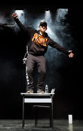 „Huligan” je predstava koja prati dogodovštine maloletnog delinkventa. Tribine, petarde, utakmice, tuče – Zrks je jedan takav tip. Sam na sceni, obučen u trenerke, sa patikama i kačketom na glavi, priča nam svoju priču i koji je put odrastanja morao preći. A sve počinje malim, sitnim problemima i začkoljicama: prvi put se napiješ, pa onda dođe prva pljuga, krenu prvi izlasci i postaneš deo supkulture. Nađeš neku grupu ljudi kojoj osećaš da pripadaš. To je zapravo vreme kada počneš da razmišljaš o sebi i pravcu prema kojem želiš da se usmeriš. Matija Šakoronja, koji tumači lik huligana – uz veoma jednostavnu scenografiju, koju čine džak, sto i stolica – prenosi nam neverovatnu energiju naizgled arogantnog i devijantnog dečaka. Kroz imitaciju više likova prepričava nam ekspresivne situacije tuča, a džak predstavlja protivnika, odlaske na utakmice, suočavanje sa policijom. Genijalno je kako je njegov glumački izražaj tako prirodan i ležeran.