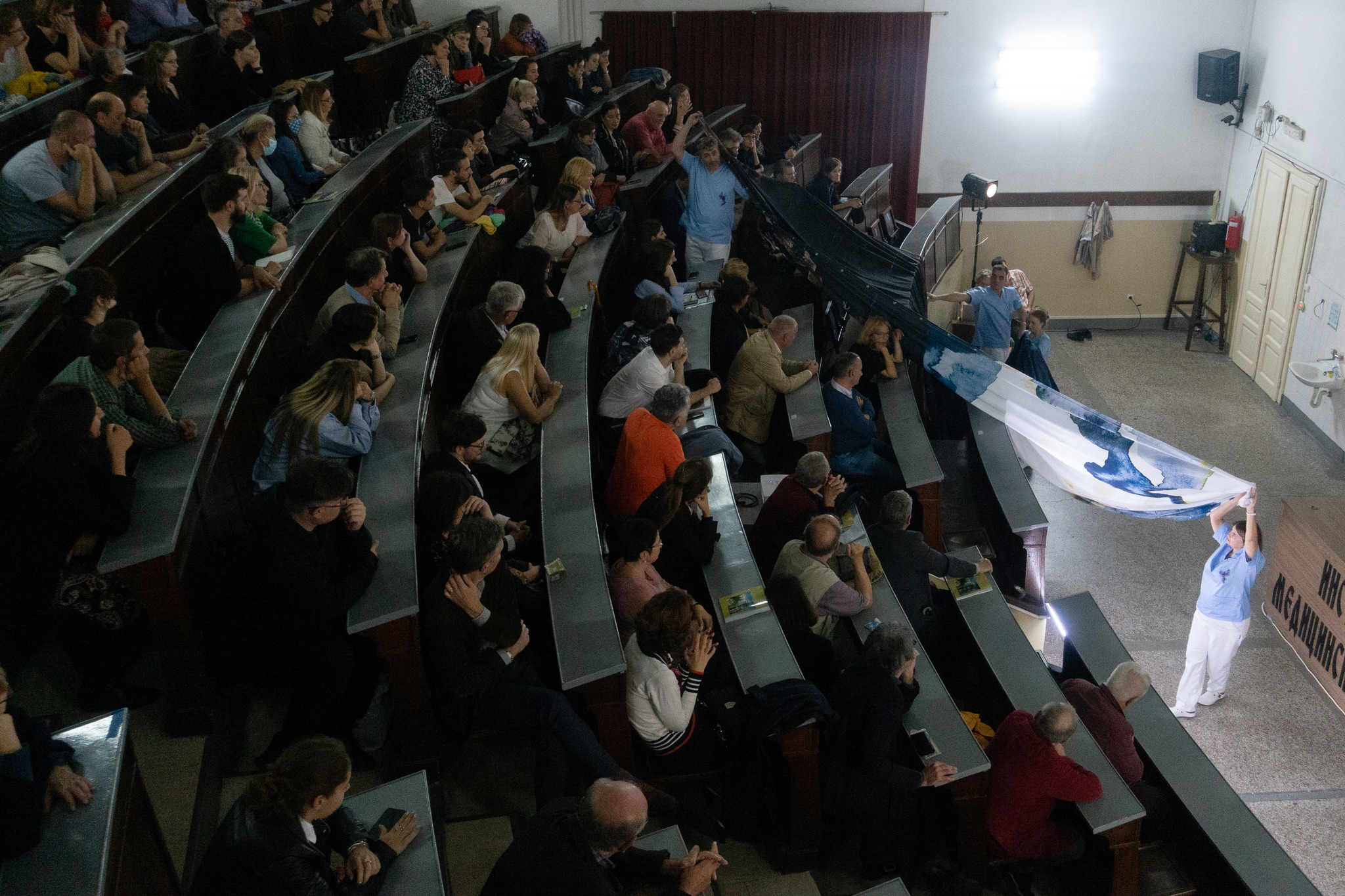 Upečatljivosti ove predstave, pored njene teme, dodatno doprinosi i prostor u kome se ova predstava igra na Bitef festivalu: amfiteatar za anatomiju Medicinskog fakulteta, mesto gde se upravo stvaraju doktori „za Nemačku”. Smeštajući predstavu u središte prostora u kome se mladi zdravstveni radnici obrazuju, Bojan Đorđev na specifičan način pomera diskurs – ti mladi ljudi su sada diplomirani lekari, specijalizovani za razne oblasti medicine i oni sada ispred profesorske katedre pričaju o drugoj strani medicine, onoj koja se ne nalazi u anatomskom atlasu. Publika sada sedi u amfiteatru i sluša o posledicama, ali ne recimo o posledicama loše ishrane na organizam, već o posledicama odlaska na organizam. Tačno je, oni savršeno dobro poznaju ljudski organizam do najsitnije ćelije, ali najbolje poznaju osećaj odlaska i ostavljanja svega iza sebe. Napuštena mesta nekima bude sećanja iz ratnog detinjstva, nekima o ljubavi, a nekima o opustošenim gradovima i napuštenim porodičnim kućama.