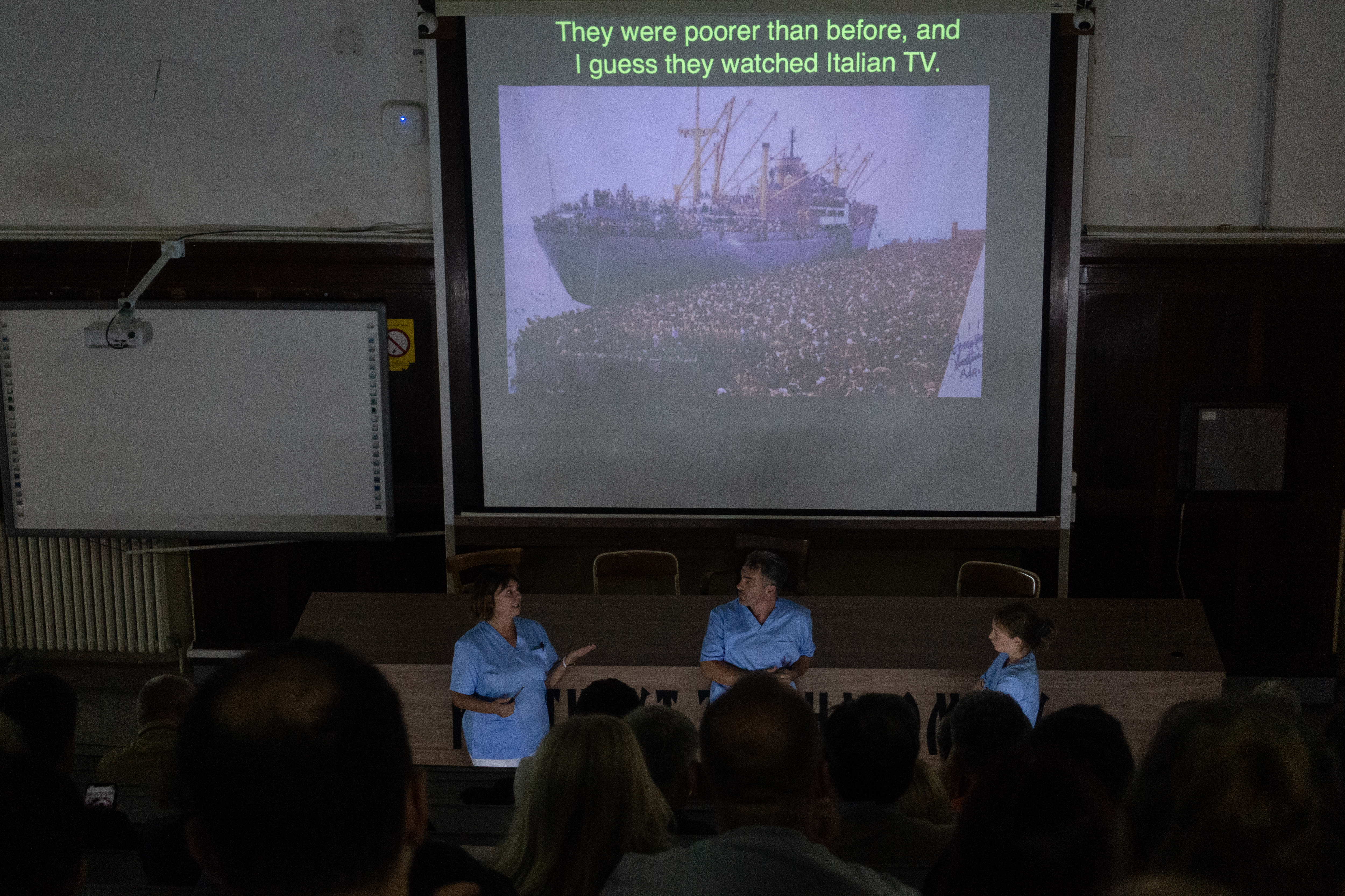Pored ovih dokumentarnih priča, u predstavi je obrađen i jedan istorijski događaj s kraja 20. veka i pripovesti o gastarbajterima i prekookeanskim migracijama. Praveći ovu digresiju na samom kraju predstave, reditelj nastoji da ukaže na globalni problem migracije. Prikazan je događaj koji je došao sa padom komunizma u Albaniji, što je ispraćeno ogromnom ekonomskom krizom, oskudicom hrane i građanskim nemirima. Brodom „Vlora” je u potrazi za boljim životom, oko 20.000 ljudi pristiglo u italijansku luku Bari. 8. avgust 1991. godine ostaće upamćen kao datum početka savremenih izbegličkih kriza. Istovremeno ovaj događaj je podsetnik kako udesa i tragedije vremena, tako i čoveka u njemu. Svedočanstvo tog dana, traje i dan danas.