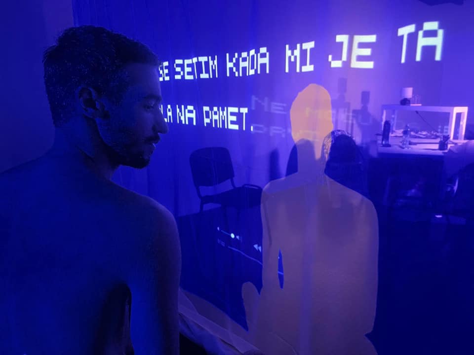Prostorija Galerije Podroom podeljena je na dva dela – u jednom je specijalna zvučna instalacija, koja posetioca stavlja u poziciju posmatrača glavnog performansa, koji se nalazi u drugom delu prostorije. Sve što deli ova dva prostora je platnena, providna zavesa.