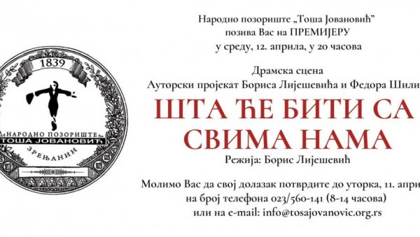 U sredu, 12. aprila, u Narodnom pozorištu „Toša Jovanović” u Zrenjaninu, biće premijerno izvedena predstava „Šta će biti sa svima nama”. Nastala je kao autorski projekat reditelja Borisa Liješevića i dramaturga Fedora Šilija.