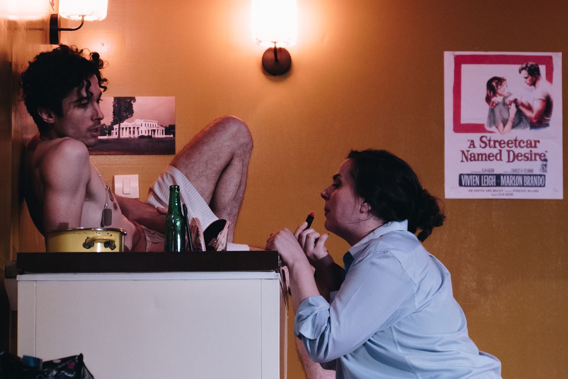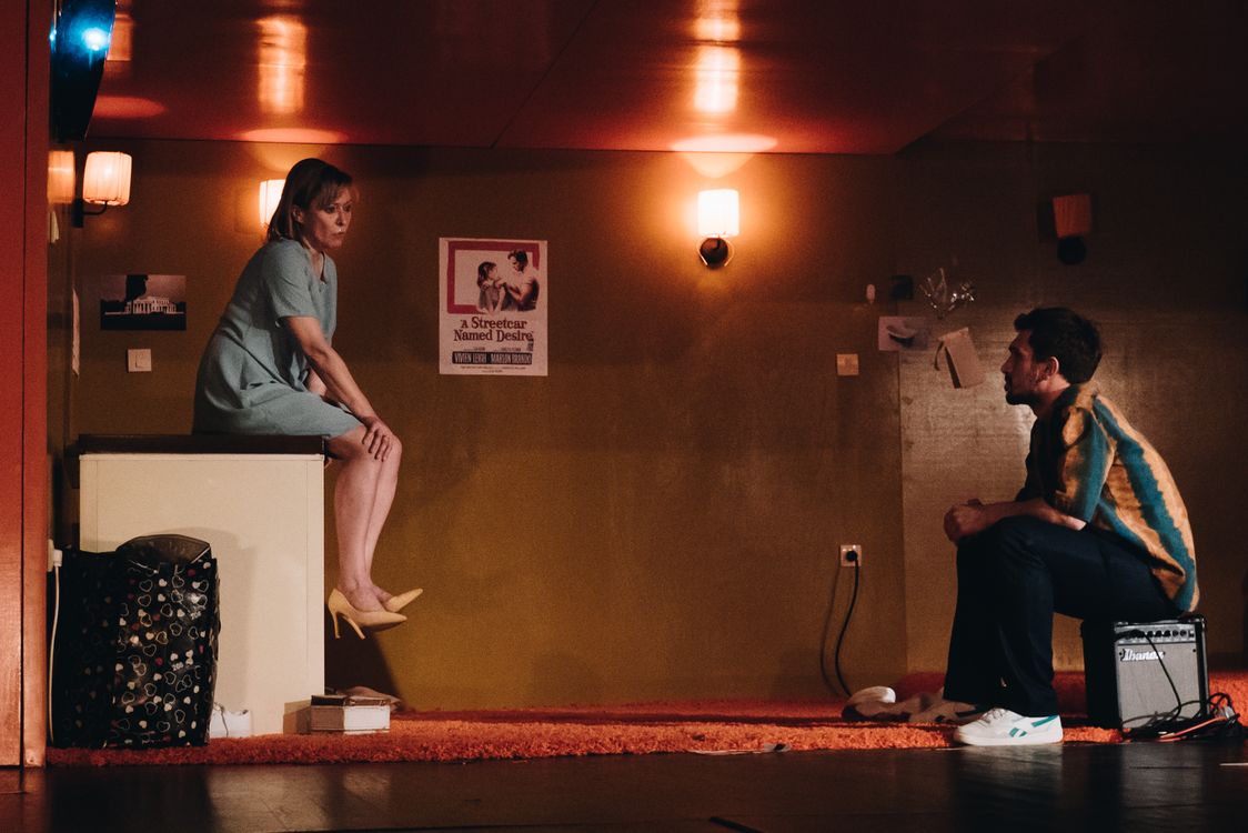 Predstava počinje kačenjem plakata filma Tramvaj zvani želja (A streetcar Named Desire) Elije Kazana, dok se u pozadini prožima glas koji se čuje preko zvučnika i koji najavljuje dane u nedelji, što može označavati bezličnu rutinu svakodnevice mladog bračnog para. Smenjivanjem dana u nedelji prikazuje se monotonija Steline i Stenlijeve bračne svakodnevice koju ispunjavaju seksualni odnosi koji se odvijaju često i mehanički, bez strasti, gledanje televizora i spavanje. Tu rutinu narušava Blanš koja dolazi kod sestre kako bi pronašla utehu i pobegla iz surove, male sredine.