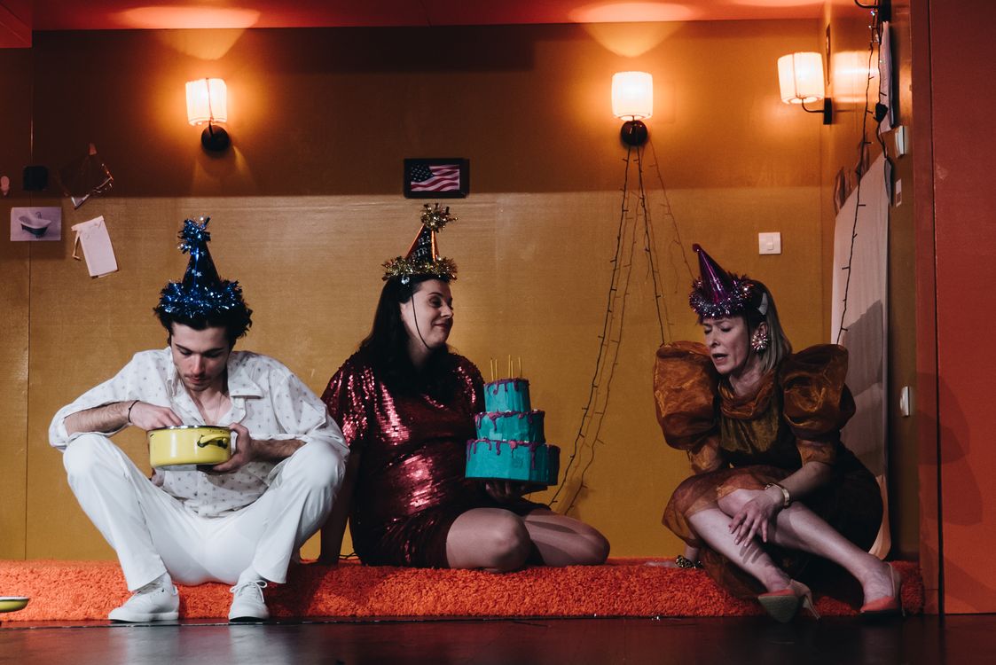 Na sceni možemo videti zgusnutu, tesnu, narandžastu sobu bez izlaza u kojoj deluje kao da su likovi zaglavljeni čak i kada nisu fizički prisutni na sceni. Ovakva inovativna i kreativna scenografija može označavati pokušaj da se prikaže nemogućnost da se izađe iz rutine sopstvenog života. Postavka se ne menja u toku izvedbe, a likovi su uvek prisutni na sceni što se može tumačiti kao simbolika večne zakopanosti i nemogućnosti da se išta promeni. Deluje kao da su likovi osuđeni jedni na druge, te da ne mogu pobeći iz surove realnosti u kojoj se nalaze.
