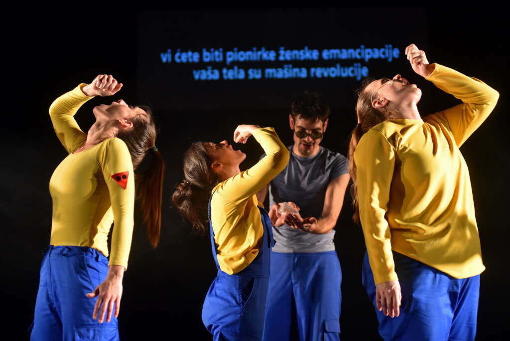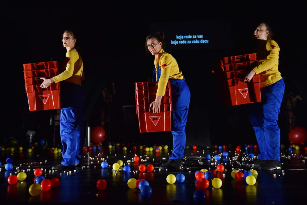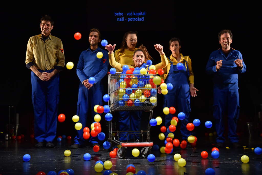 Muzika je preteća, deklamujuća, otvara problematiku, zatvara je na momente da bi je ponovo otvorila, sve sa određenom dozom cinične ironije prema problemu dehumanizovanja, koji leži u osnovi svih petnaest slika ove predstave. U pogledu same režije, čija je suštinska funkcija oslikavanje problematike teksta, dosledan je Mladenovićev stil, te tako scena predstavlja tri fabričke trake preko i oko kojih orbitiraju akteri predstave, uniformisani radnici, transponujući sebe i jedni druge preko tih traka, porađajući obojene loptice i balone koji simuliraju jajne ćelije i materice. Svaki element na sceni podjednako je u svrsi depersonalizacije koliko i sam tekst koji nam na nju ukazije - glumci su radnici, dakle ništa više od radne snage, tela koja energiju ulažu u produktivni proces - a taj proces je ovoga puta, re-produktivni. Čitava predstava je fabrički proces, jedno neprekidno prolaženje kroz scenski prostor na fabričkoj traci, koja ukrug reprodukuje obesmišljeno kretanje - a tela na sceni samo su sredstvo izraza obezličenosti koja proklamuje kolektivni revolt i ponovno „riklejmovanje” materica i ideniteta.
