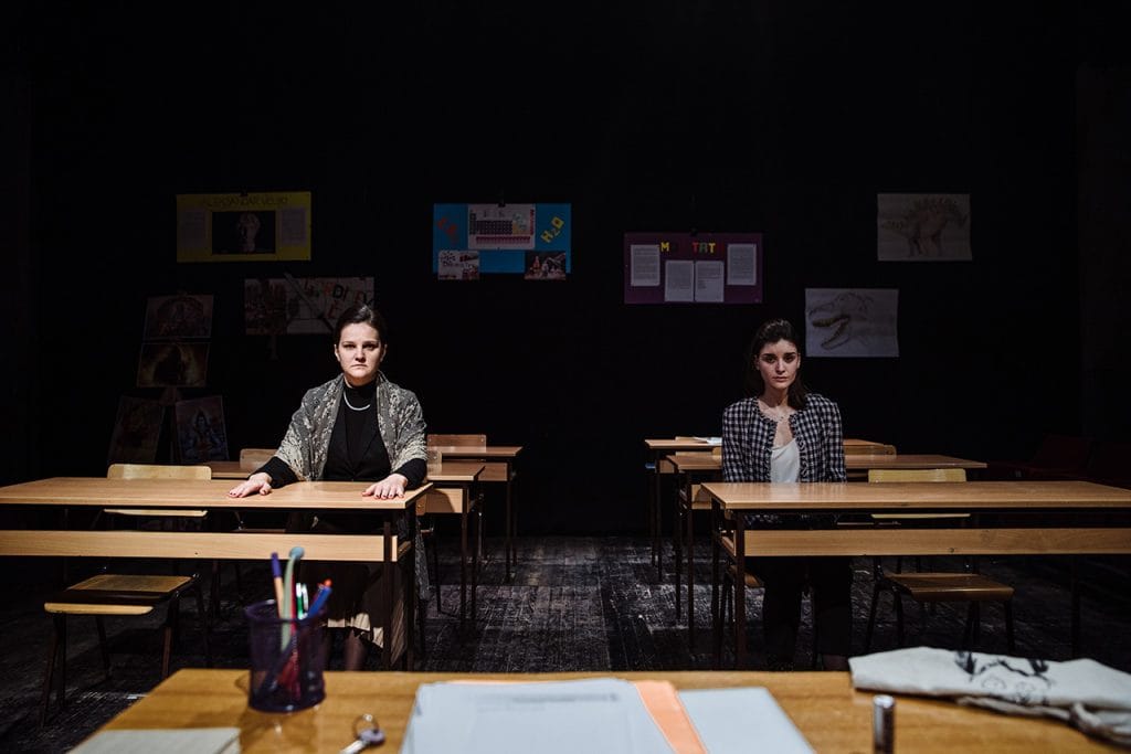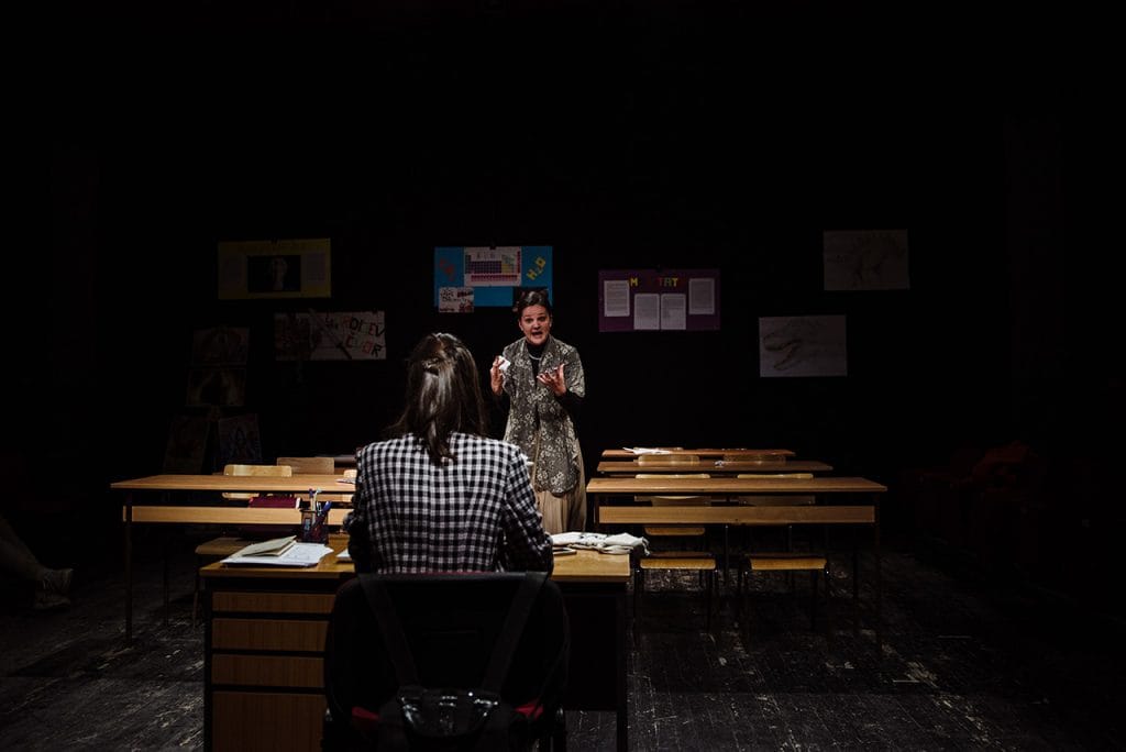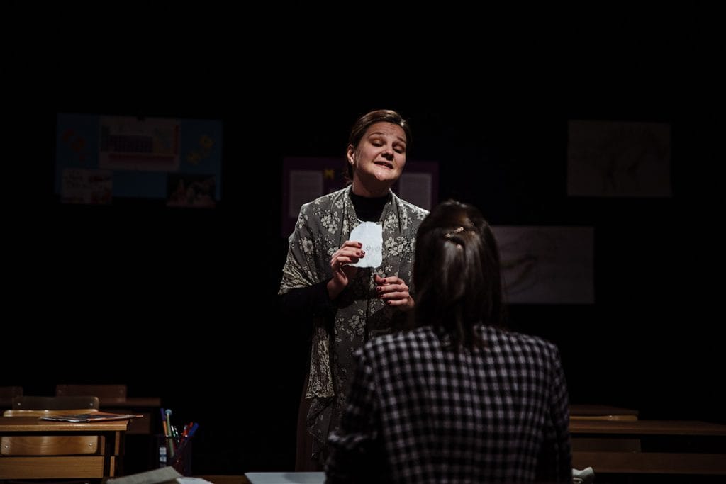 Već postavka predstave na kamernu scenu, jasno je ukazala na intimističku stranu teksta koji su, kroz sat i po vremena ispunjenog emocionalnim nabojem, oživele dve sjajne glumice: Bojana Milanović u ulozi majke Korin i Simonida Mandić koja je tumačila ulogu učiteljice Heder. Gledaoci, postavljeni u ravni sa glumcima, postali su nemi svedoci tragedije koja prethodi glavnoj radnji, ali i svim onim pitanjima koje je ona za sobom ostavila.