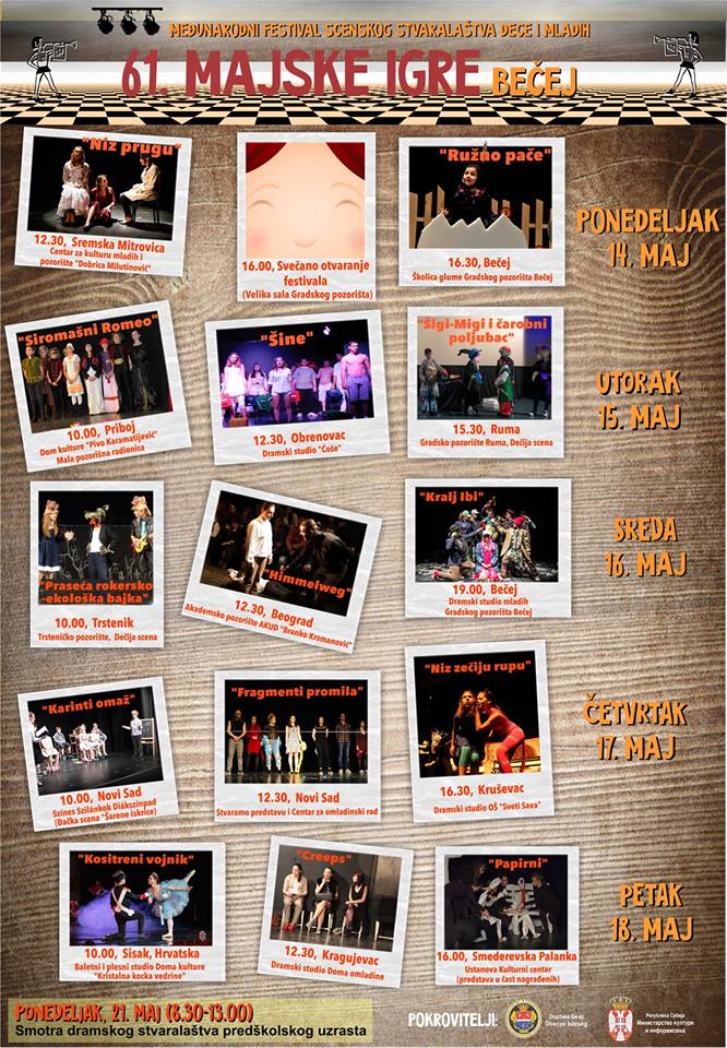 U petak, 18. maja, priveden je kraju međunarodni festival scenskog stvaralaštva za decu i mlade- Majske igre. Po 61. put, Bečej je ugostio mlade i decu koji se bave pozorištem, a tokom četiri dana je svakodnevicu publike ulepšavao raznim predstavama, u nekoliko termina dnevno. U petak, kada je završen takmičarski deo festivala, dodeljene su i nagrade najboljima, u dve kategorije: kategoriji za decu i kategoriji za mlade.